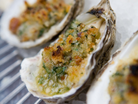 Barbecued oysters are grilled over mesquite, dabbed with smokey tomato chili butter or herb butter with a sourdough crumb. Served on a warm bed of rock salt.